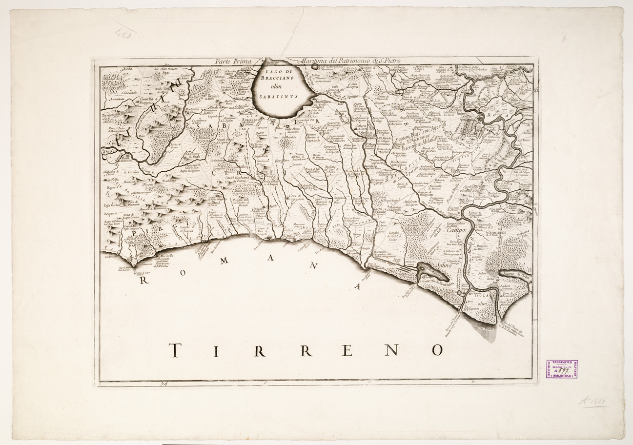 "...CON LE SUE PIU' COSPICUE STRADE ANTICHE E MODERNE E PRINCIPALI CASALI, E TENUTE DI ESSO DESCRITTO DA GIACOMO FILIPPO AMETI ROMANO DATO IN LUCE DA DOMENICO DE ROSSI, ECC., IN ROMA ALLA PACE. Quattro fogli incisi su rame con i seguenti sottotitoli: 1) Parte prima maritima del Patrimonio di S. Pietro 2) Parte seconda maritima, ecc. 3) Parte prima terrestra, ecc. 4) Parte seconda terrestra, ecc. Orientazione: nord spostato a destra. Orografia prospettica a monticelli. Abitati principali rappresentati con torri e case, gli altri con circolini. Sono indicati i boschi a mezzo di alberelli. Toponomastica in italiano con voci corrispondenti in latino: sono pure indicati i nomi dei proprietari di feudi, tenute, ville, ecc. Il foglio N° 3 contiene la dedica al Cardinale Francesco Nerli firmata Domenico de Rossi. Due copie. Cfr. ALMAGIA' R., L'Italia di G. A. Magini, ecc., pag. 137."