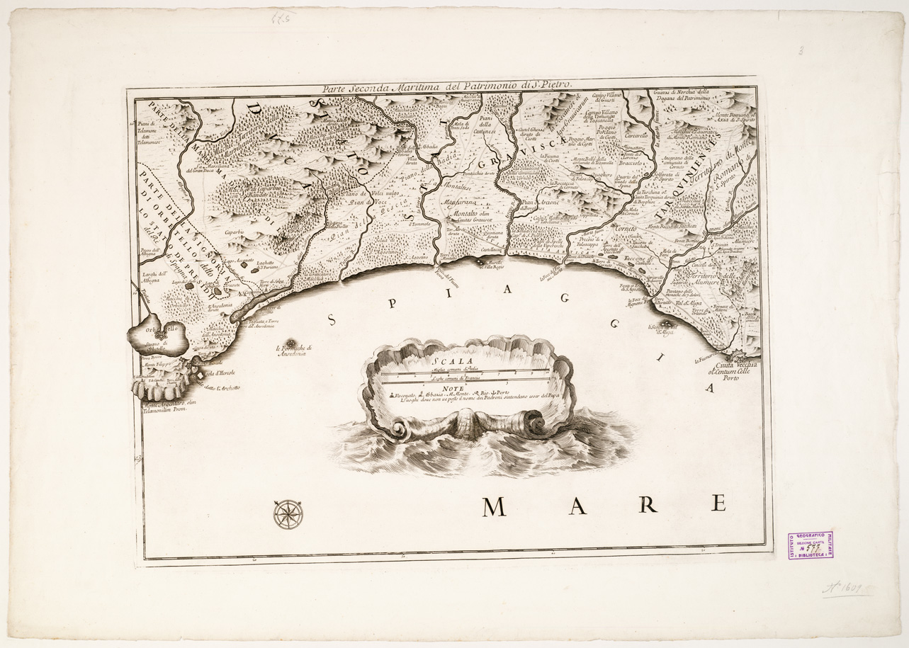 "...CON LE SUE PIU' COSPICUE STRADE ANTICHE E MODERNE E PRINCIPALI CASALI, E TENUTE DI ESSO DESCRITTO DA GIACOMO FILIPPO AMETI ROMANO DATO IN LUCE DA DOMENICO DE ROSSI, ECC., IN ROMA ALLA PACE. Quattro fogli incisi su rame con i seguenti sottotitoli: 1) Parte prima maritima del Patrimonio di S. Pietro 2) Parte seconda maritima, ecc. 3) Parte prima terrestra, ecc. 4) Parte seconda terrestra, ecc. Orientazione: nord spostato a destra. Orografia prospettica a monticelli. Abitati principali rappresentati con torri e case, gli altri con circolini. Sono indicati i boschi a mezzo di alberelli. Toponomastica in italiano con voci corrispondenti in latino: sono pure indicati i nomi dei proprietari di feudi, tenute, ville, ecc. Il foglio N° 3 contiene la dedica al Cardinale Francesco Nerli firmata Domenico de Rossi. Due copie. Cfr. ALMAGIA' R., L'Italia di G. A. Magini, ecc., pag. 137."