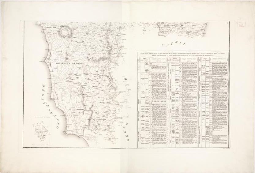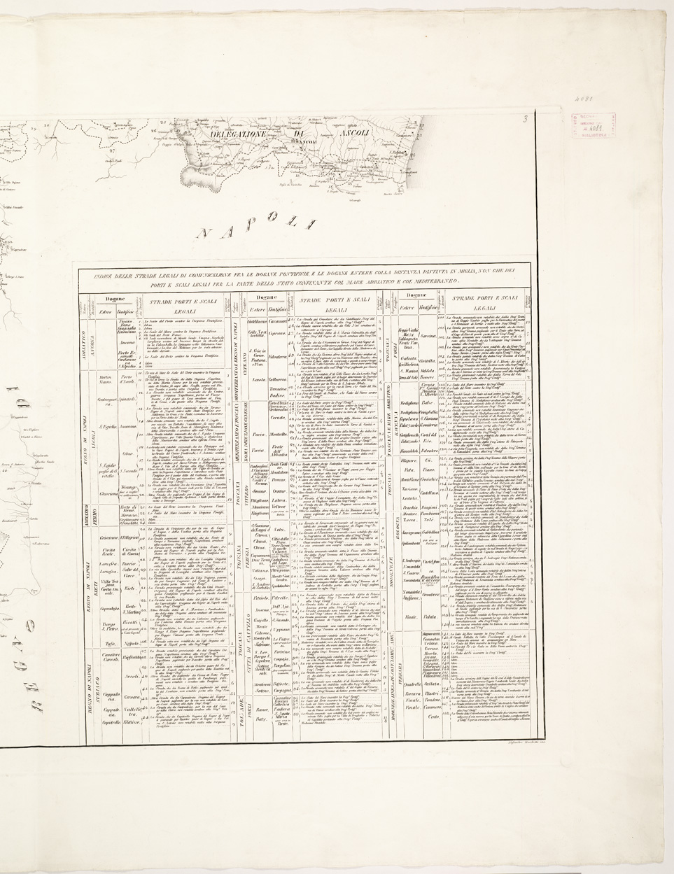 "...INDICANTE LE DOGANE I POSTI ARMATI DALLA TRUPPA DI FINANZA, LE STRADE DOGANALI, LA FASCIA BIMILIARE DI DIVIETO E LE DOGANE ESTERE CHE CORRISPONDONO ALLE PONTIFICIE. Tre fogli incisi su rame da Aless. Moschetti su disegno di Gaetano Spinelli. Essi rappresentano rispettivamente: 1) il territorio compreso tra i confini del Granducato di Toscana, Civitavecchia e Ripatransone 2) da Civitavecchia a Terracina ai confini col Regno di Napoli 3) dai confini con la Toscana, Ducato di Modena e Regno Lombardo-Veneto all'Adriatico. Orografia a tratteggio a luce zenitale. Il foglio N° 1 contiene la leggenda dei segni convenzionali il foglio N° 2 reca un indice delle strade legali di comunicazione tra le dogane pontificie e quelle estere con indicazione delle distanze calcolate in miglia e dei porti e degli scali legali il foglio N° 3 contiene il titolo. Scala grafica in miglia romane. La copia d'Arch. (Files A0001273-77) è in 6 fogli (dei quali mancante quello che comprende il Lazio) montati su tela, delle dimensioni di m. 0,46x0,57 ognuno. Non rappresenta l'orografia: i territori amministrativi sono distinti a colori le strade postali sono in nero: le provinciali e comunali in rosso e in giallo rispettivamente. Le acque sono in azzurro. I centri abitati in rosso. Il foglio I contiene il titolo il foglio III la leggenda dei segni convenzionali il foglio VI l'indice delle strade legali di comunicazione fra le dogane pontificie, e le dogane estere colla distanza distinta in miglia, ecc., ecc."
