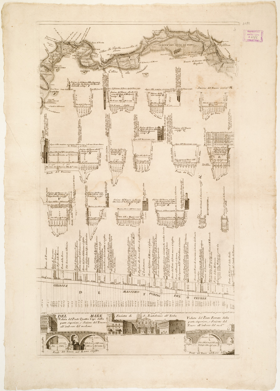 "Quattro tavole incise su rame delineate da Andrea Chiesa e Bernardo Gambarini Ingegneri. Sono sussidiate da profili, sezioni, vedute di ponti, ecc. Rappresentano il corso del Tevere e le immediate adiacenze. Scala grafica in canne romane. Cfr. anche allo stesso numero 38 d'Ordine e allo stesso numero d'Inv. Generale: "Sezione del Tevere in faccia al Palazzo Falconieri..." - File B0002799 e "Andamento del corso del Tevere..." - File B0002801."