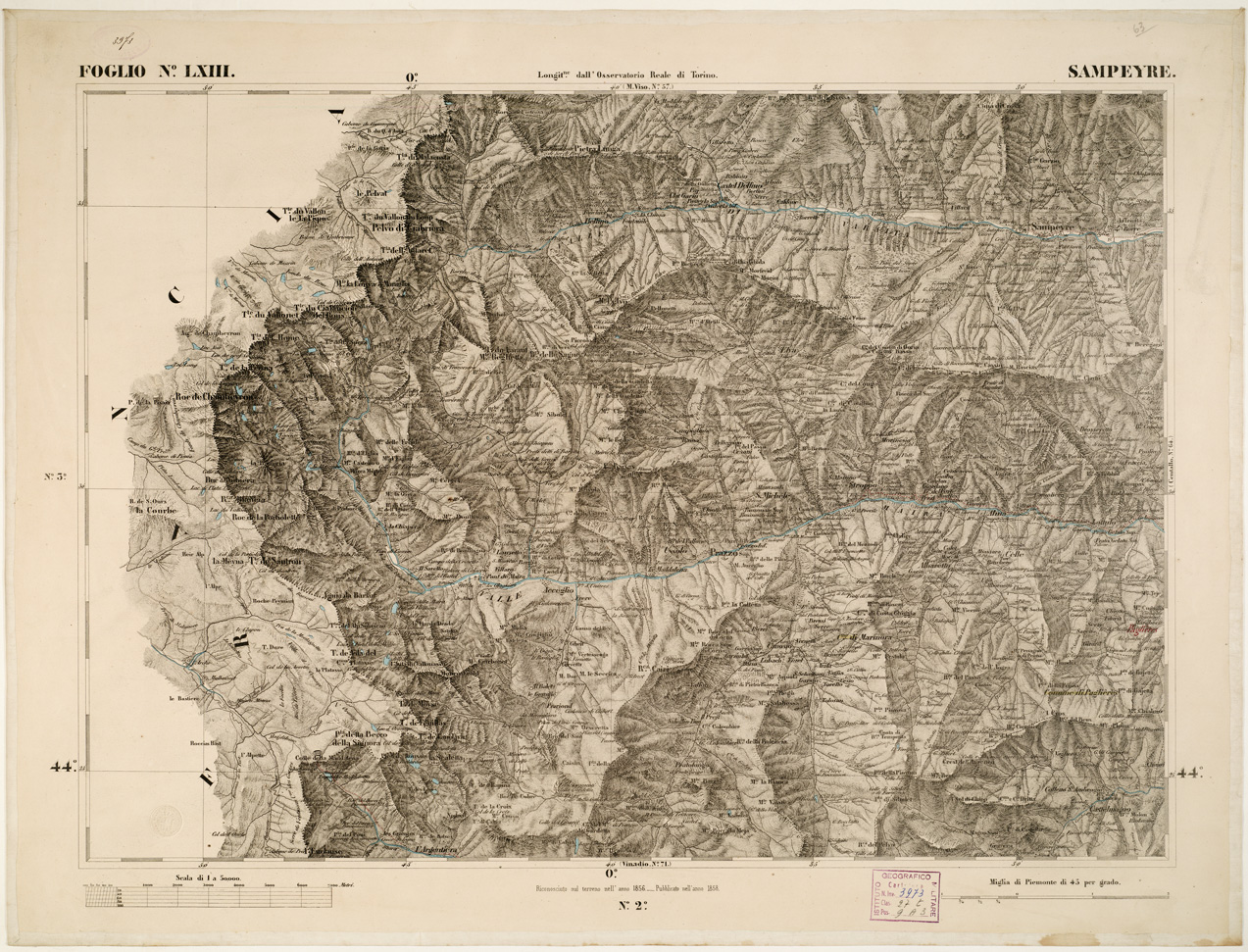 "...DI S. M. IL RE DI SARDEGNA ALLA SCALA DI 1:50.000. OPERA DEL CORPO REALE DELLO STATO MAGGIORE. Riproduzione litografica in nero e azzurro per le acque della carta già descritta al N° 97 d'ordine (Cart. d'Arch. n. 18 e 19. Docum. n. 21). Annessi due quadri d'unione alle scale di 1:1.000.000 e di 1:1.500.000, con indicazione delle varianti nei segni convenzionali sui fogli riveduti e corretti. Una parte del territorio fa parte dell'attuale Francia e Svizzera. L'edizione della carta al numero d'inventario 81 è stata passata in carico allo S.M.E. a Roma al numero d'inventario 82 vi è un'edizione composta da 87 fogli. Vi è una copia alla cartella d'archivio n. 44 documento n. 77."