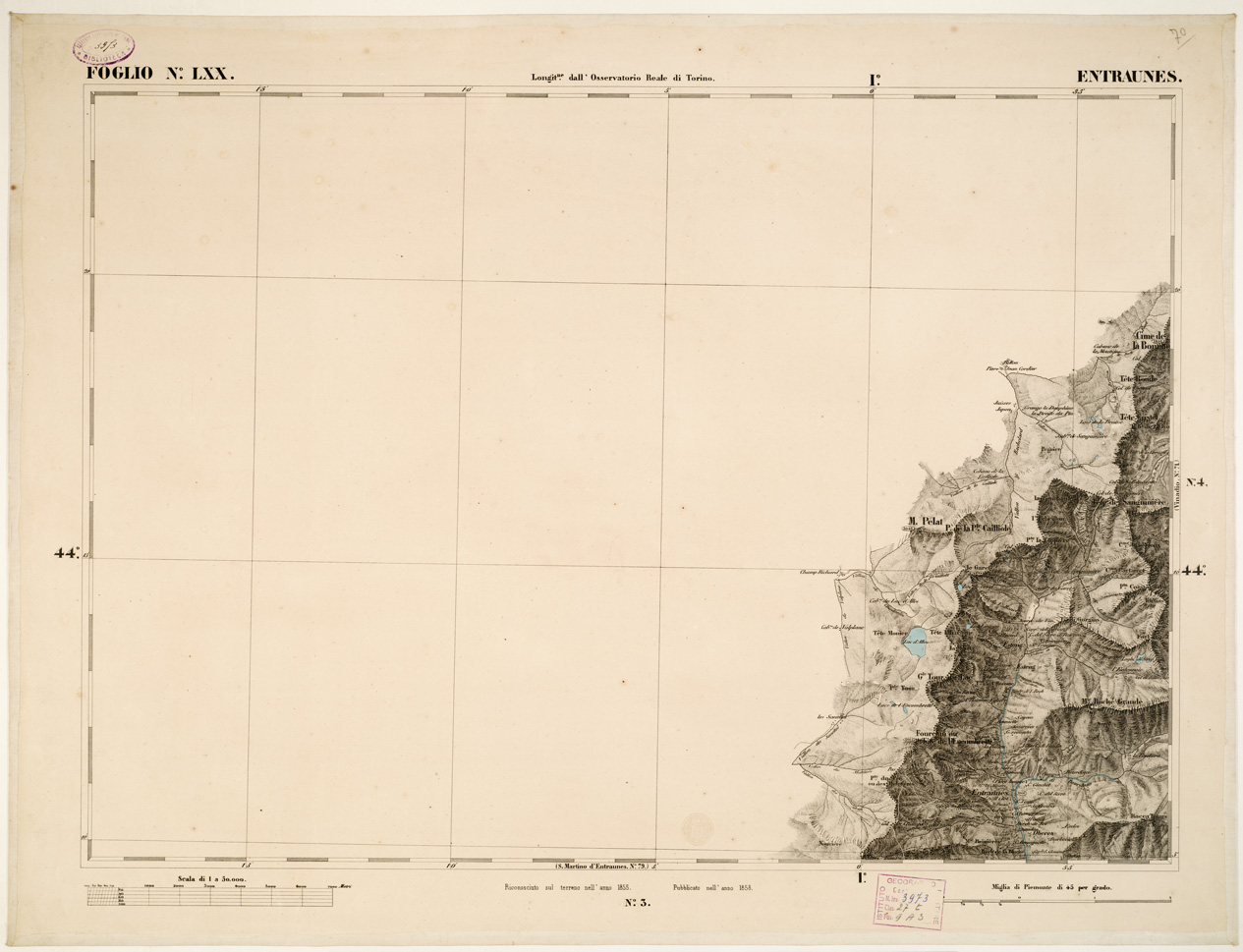 "...DI S. M. IL RE DI SARDEGNA ALLA SCALA DI 1:50.000. OPERA DEL CORPO REALE DELLO STATO MAGGIORE. Riproduzione litografica in nero e azzurro per le acque della carta già descritta al N° 97 d'ordine (Cart. d'Arch. n. 18 e 19. Docum. n. 21). Annessi due quadri d'unione alle scale di 1:1.000.000 e di 1:1.500.000, con indicazione delle varianti nei segni convenzionali sui fogli riveduti e corretti. Una parte del territorio fa parte dell'attuale Francia e Svizzera. L'edizione della carta al numero d'inventario 81 è stata passata in carico allo S.M.E. a Roma al numero d'inventario 82 vi è un'edizione composta da 87 fogli. Vi è una copia alla cartella d'archivio n. 44 documento n. 77."