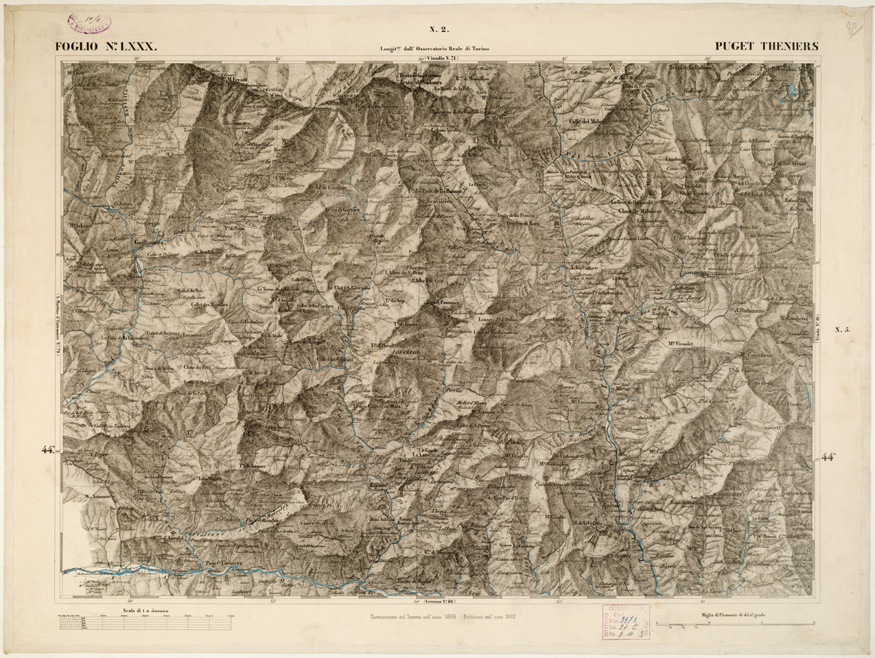 "...DI S. M. IL RE DI SARDEGNA ALLA SCALA DI 1:50.000. OPERA DEL CORPO REALE DELLO STATO MAGGIORE. Riproduzione litografica in nero e azzurro per le acque della carta già descritta al N° 97 d'ordine (Cart. d'Arch. n. 18 e 19. Docum. n. 21). Annessi due quadri d'unione alle scale di 1:1.000.000 e di 1:1.500.000, con indicazione delle varianti nei segni convenzionali sui fogli riveduti e corretti. Una parte del territorio fa parte dell'attuale Francia e Svizzera. L'edizione della carta al numero d'inventario 81 è stata passata in carico allo S.M.E. a Roma al numero d'inventario 82 vi è un'edizione composta da 87 fogli. Vi è una copia alla cartella d'archivio n. 44 documento n. 77."