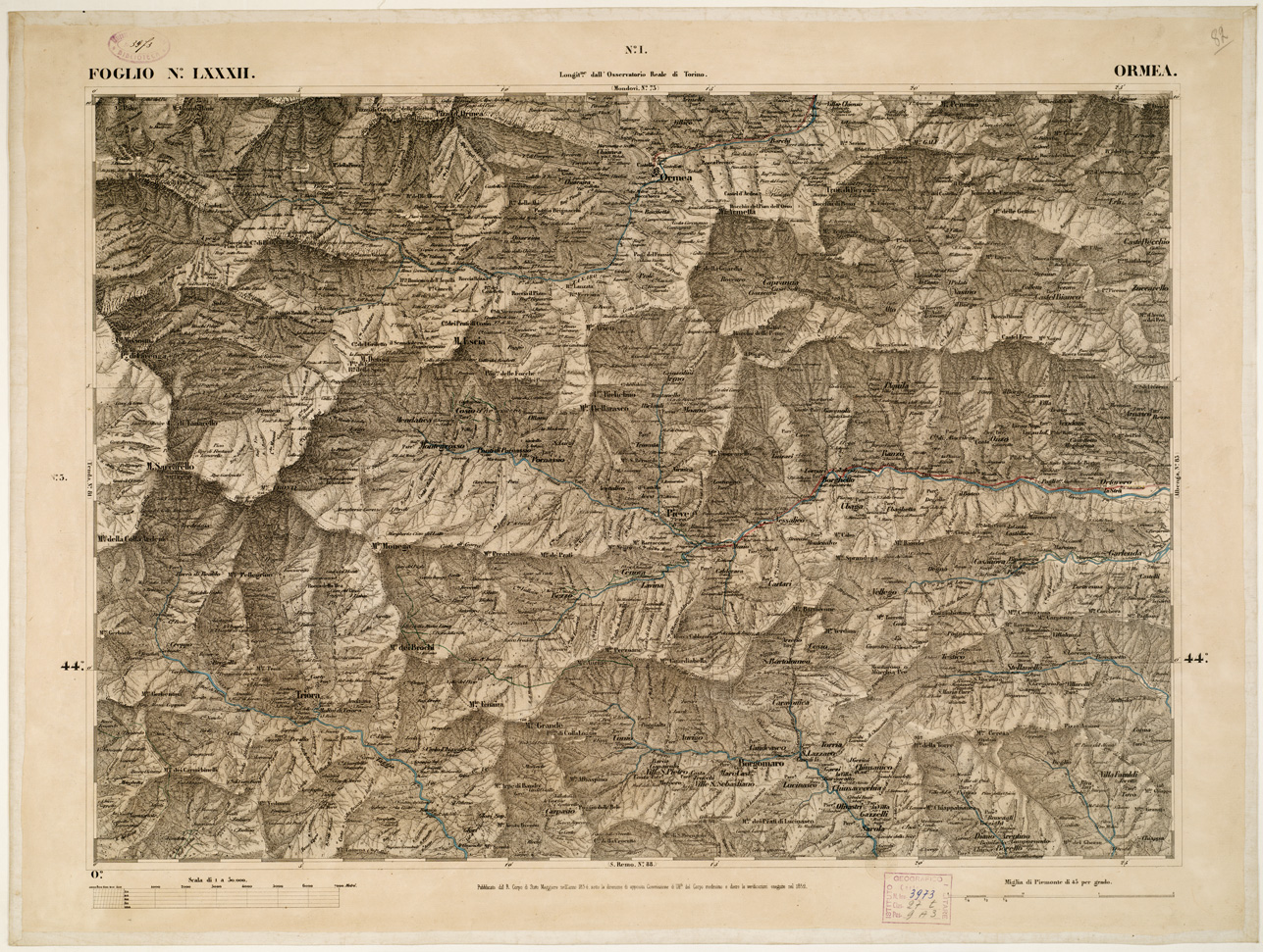 "...DI S. M. IL RE DI SARDEGNA ALLA SCALA DI 1:50.000. OPERA DEL CORPO REALE DELLO STATO MAGGIORE. Riproduzione litografica in nero e azzurro per le acque della carta già descritta al N° 97 d'ordine (Cart. d'Arch. n. 18 e 19. Docum. n. 21). Annessi due quadri d'unione alle scale di 1:1.000.000 e di 1:1.500.000, con indicazione delle varianti nei segni convenzionali sui fogli riveduti e corretti. Una parte del territorio fa parte dell'attuale Francia e Svizzera. L'edizione della carta al numero d'inventario 81 è stata passata in carico allo S.M.E. a Roma al numero d'inventario 82 vi è un'edizione composta da 87 fogli. Vi è una copia alla cartella d'archivio n. 44 documento n. 77."