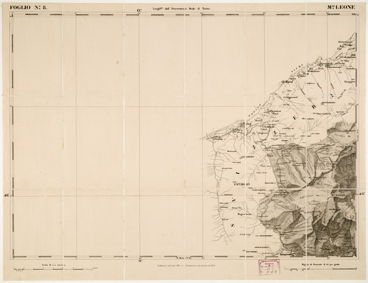 "...DI S. M. IL RE DI SARDEGNA ALLA SCALA DI 1:50.000. OPERA DEL CORPO REALE DELLO STATO MAGGIORE. Riproduzione litografica in nero e azzurro per le acque della carta già descritta al N° 97 d'ordine (Cart. d'Arch. n. 18 e 19. Docum. n. 21). Annessi due quadri d'unione alle scale di 1:1.000.000 e di 1:1.500.000, con indicazione delle varianti nei segni convenzionali sui fogli riveduti e corretti. Una parte del territorio fa parte dell'attuale Francia e Svizzera. L'edizione della carta al numero d'inventario 81 è stata passata in carico allo S.M.E. a Roma al numero d'inventario 3973 vi è un'edizione composta 93 fogli. Vi è una copia alla cartella d'archivio n. 44 documento n. 77."