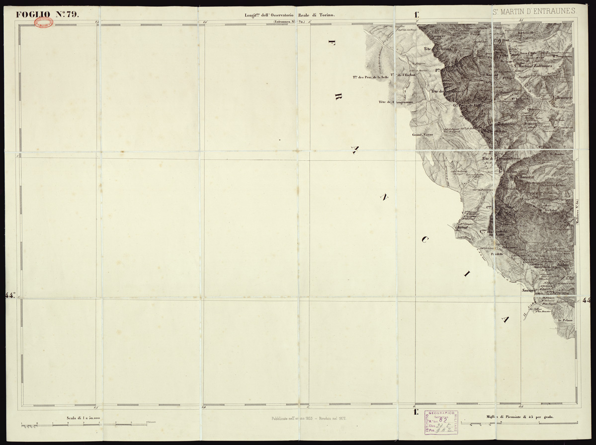 "...DI S. M. IL RE DI SARDEGNA ALLA SCALA DI 1:50.000. OPERA DEL CORPO REALE DELLO STATO MAGGIORE. Riproduzione litografica in nero e azzurro per le acque della carta già descritta al N° 97 d'ordine (Cart. d'Arch. n. 18 e 19. Docum. n. 21). Annessi due quadri d'unione alle scale di 1:1.000.000 e di 1:1.500.000, con indicazione delle varianti nei segni convenzionali sui fogli riveduti e corretti. Una parte del territorio fa parte dell'attuale Francia e Svizzera. L'edizione della carta al numero d'inventario 81 è stata passata in carico allo S.M.E. a Roma al numero d'inventario 3973 vi è un'edizione composta 93 fogli. Vi è una copia alla cartella d'archivio n. 44 documento n. 77."