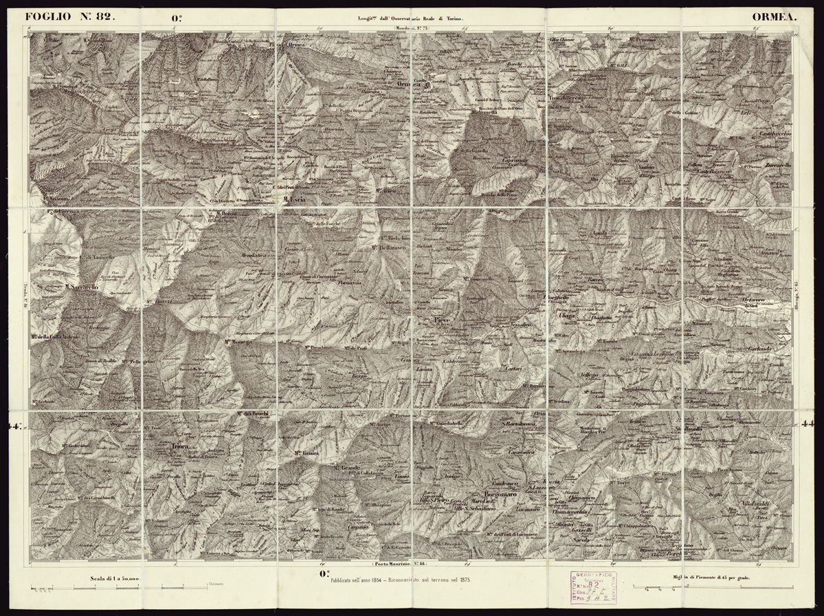 "...DI S. M. IL RE DI SARDEGNA ALLA SCALA DI 1:50.000. OPERA DEL CORPO REALE DELLO STATO MAGGIORE. Riproduzione litografica in nero e azzurro per le acque della carta già descritta al N° 97 d'ordine (Cart. d'Arch. n. 18 e 19. Docum. n. 21). Annessi due quadri d'unione alle scale di 1:1.000.000 e di 1:1.500.000, con indicazione delle varianti nei segni convenzionali sui fogli riveduti e corretti. Una parte del territorio fa parte dell'attuale Francia e Svizzera. L'edizione della carta al numero d'inventario 81 è stata passata in carico allo S.M.E. a Roma al numero d'inventario 3973 vi è un'edizione composta 93 fogli. Vi è una copia alla cartella d'archivio n. 44 documento n. 77."