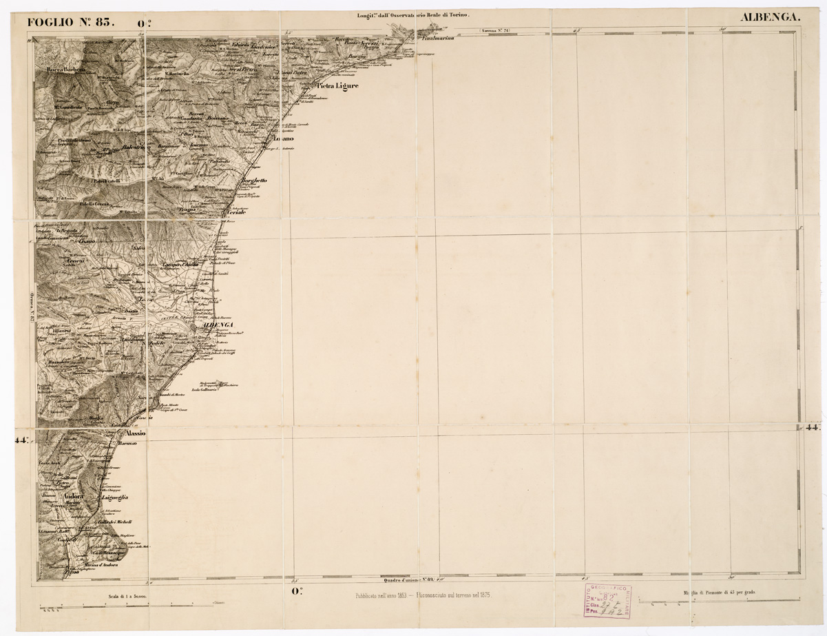 "...DI S. M. IL RE DI SARDEGNA ALLA SCALA DI 1:50.000. OPERA DEL CORPO REALE DELLO STATO MAGGIORE. Riproduzione litografica in nero e azzurro per le acque della carta già descritta al N° 97 d'ordine (Cart. d'Arch. n. 18 e 19. Docum. n. 21). Annessi due quadri d'unione alle scale di 1:1.000.000 e di 1:1.500.000, con indicazione delle varianti nei segni convenzionali sui fogli riveduti e corretti. Una parte del territorio fa parte dell'attuale Francia e Svizzera. L'edizione della carta al numero d'inventario 81 è stata passata in carico allo S.M.E. a Roma al numero d'inventario 3973 vi è un'edizione composta 93 fogli. Vi è una copia alla cartella d'archivio n. 44 documento n. 77."
