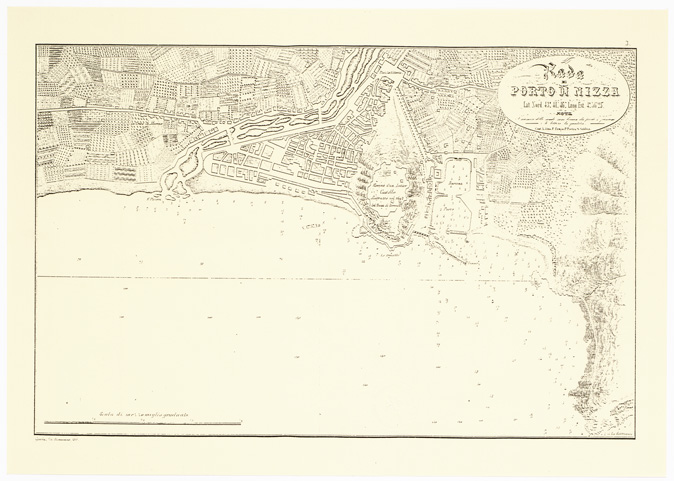 "Rada e porto di Nizza Lat. Nord 43°41'46" Long. Est 4°36'25". Genova, Lit. Armanino. La carta è in contenitore ed è composta da 33 fogli per la parte descrittiva e 24 fogli per la parte cartografica idrografica della costa ligure."