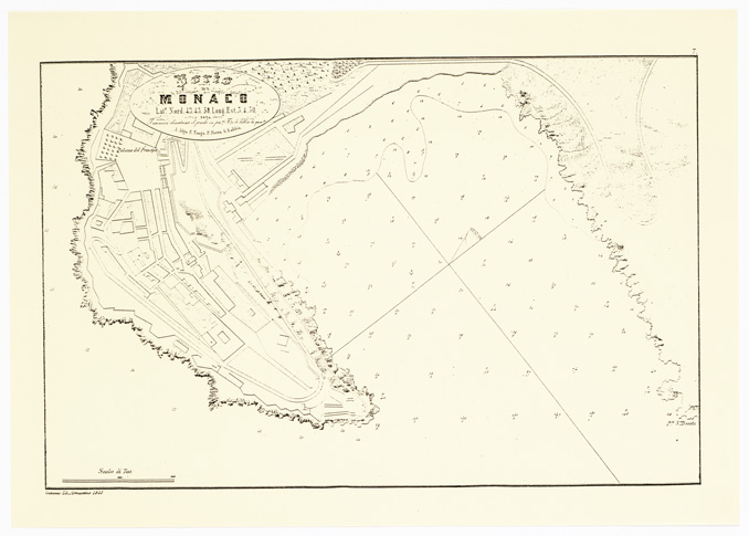 "Porto di Monaco Lat.e Nord 43°43'58" Long. Est 3°4'30". A. Alga, F. Fanga, P. Pietra e S. Sabbia. Genova, Lit. Armanino. La carta è in contenitore ed è composta da 33 fogli per la parte descrittiva e 24 fogli per la parte cartografica idrografica della costa ligure."