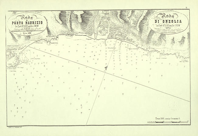 "Rada e Porto Maurizio Lat. Nord 43°32'30" Long. Est 3°40'40". Rada di Oneglia Lat. Nord 43°53'12" Long. Est 5°42'30". Genova, Lit. Armanino. La carta è in contenitore ed è composta da 33 fogli per la parte descrittiva e 24 fogli per la parte cartografica idrografica della costa ligure."
