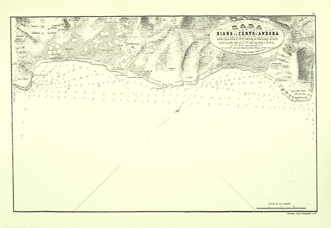 "Rada di Diano il Cervo e Andora Lat. del Cap. di Berla 43°53'32" Nord Long. del Merid. di Parigi 3°44'40" Est Lat. del Cap. delle Mele 43°57'22" Nord Long. Parigi 5°30'10" Est. Genova, Lit. Armanino. La carta è in contenitore ed è composta da 33 fogli per la parte descrittiva e 24 fogli per la parte cartografica idrografica della costa ligure."