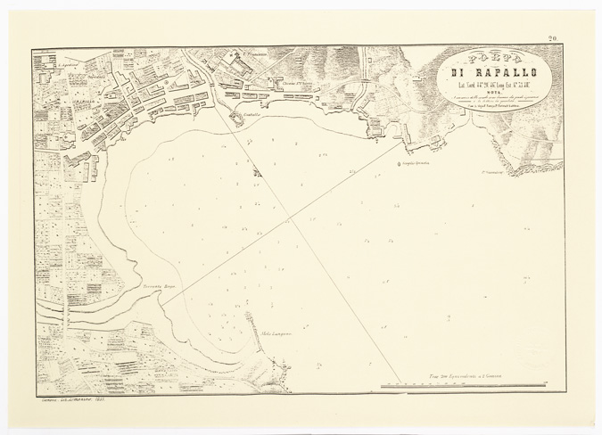 "Porto di Rapallo Lat. Nord 44°20'46" Long. Est 6°53'40". Genova, Lit. Armanino. La carta è in contenitore ed è composta da 33 fogli per la parte descrittiva e 24 fogli per la parte cartografica idrografica della costa ligure."