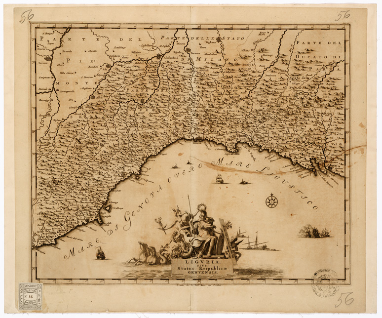 "Foglio unico inciso su rame e montato su tela. Longitudini calcolate dal meridiano delle isole di Capo Verde. Orografia prospettica a monticelli. Abitati rappresentati con torri e case: i principali centri schematicamente in pianta. Manca la rete stradale. Sono tracciati i confini. Limiti: nord, Tortona sud, Mare Ligustico ovest, Turino est, Carrara. Sotto il titolo è la firma dell'autore "D. Stoopendaal Schulp.". In basso è scritto: "P. vander Aa. Exc. Lugd. Batav. cum privilegio". Cfr. ARRIGONI e BERTARELLI, Le carte geografiche dell'Italia, conservate nella Raccolta delle stampe e dei disegni - Catalogo descrittivo - Comune di Milano, 1930, N° 986."