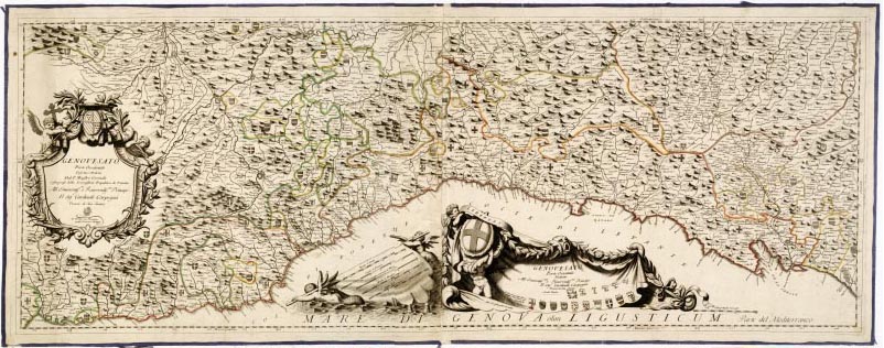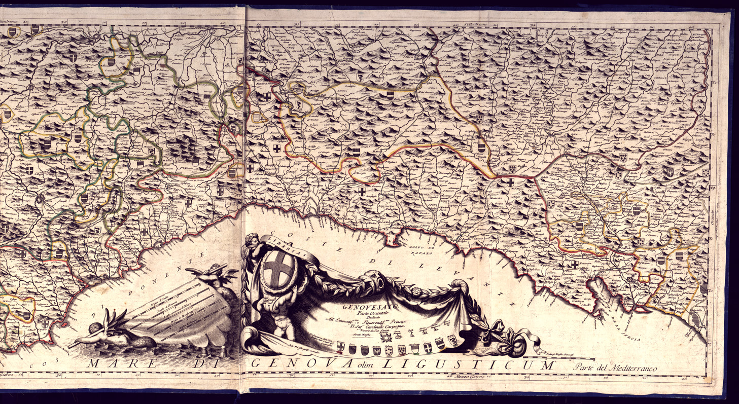 "IL SIG. CARDINALE CARPEGNA ecc. IN VENETIA CON PRIVILEGIO PRESSO DOMENICO PADOANI. Segue sul foglio orientale: GENOVESATO PARTE ORIENTALE DEDICATO ECC., ECC. Due fogli incisi su rame montati su tela. Orientazione normale. Longitudini calcolate dal meridiano delle isole di Capo Verde. Orografia rappresentata a monticelli. Centri abitati importati rappresentati schematicamente in pianta: gli altri con torri e case e distinti secondo la loro importanza. Sono tracciate le strade e indicate le stazioni di posta. Confini a colori."