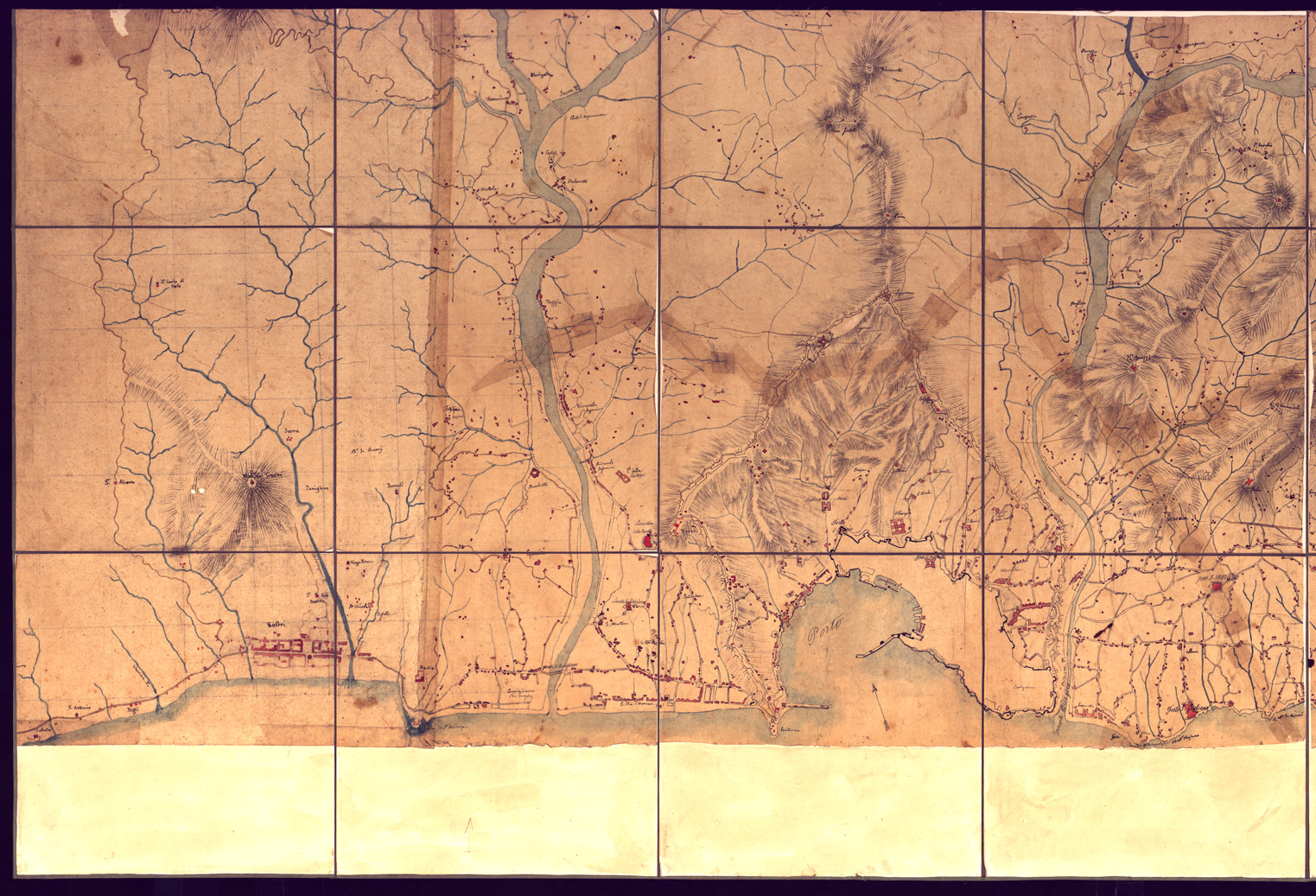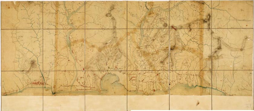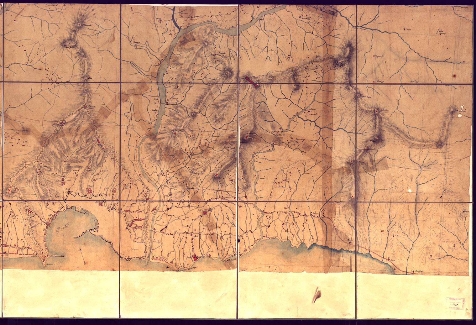 "Tre fogli in carta lucida montata su tela a stacchi. Rappresentazione orografica a tratteggio."