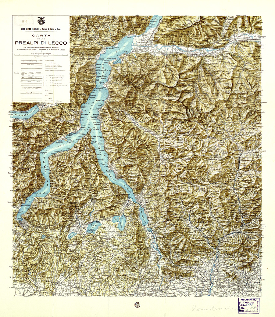 "Carta coi tipi dell'I.G.M. e stampata dalla Tipo-Litografia F.lli Grassi di Lecco Club Alpino Italiano - Sezioni di Lecco e Como. Rappresentazione orografica a curve a sfumo, l'equidistanza è di 50 metri."