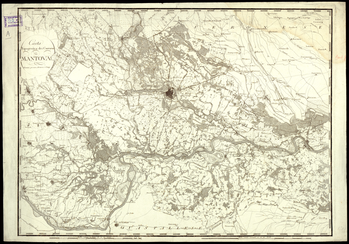 "...VIENNA PRESSO ARTARIA E COMP. (s. d.). Incisione su rame di Ponheimer foglio unico stampato in nero senza scala. Il territorio rappresentato si estende da Pozzolo (nord) a Guastalla (sud) e da Casalmaggiore (ovest) a Ostiglia (est). La carta è tratta da quella della Lombardia costruita dagli astronomi di Brera dal 1788 al 1796. (Vedi n. 38 d'ordine. Coll. Bianconi n. 69)."