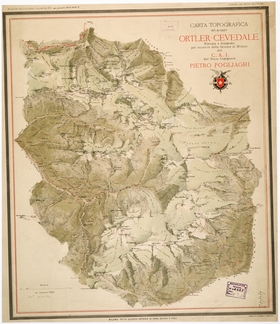"...RILEVATA E DISEGNATA PER INCARICO DELLA SEZIONE DI MILANO DEL C.A.I. DAL SOCIO INGEGNEREPIETRO POGLIAGHI (s. d.). MILANO, CASA EDITRICE ARTARIA DI FERD. SACCHI E FIGLI. Carta geometrica artistica in cromo. Il terreno è rappresentato con curve dimostrative sussidiate da ombreggio a luce obliqua. Viabilità in rosso ghiacciai rappresentati in tinta azzurrognola. Toponomastica in italiano in tedesco nella zona austriaca."