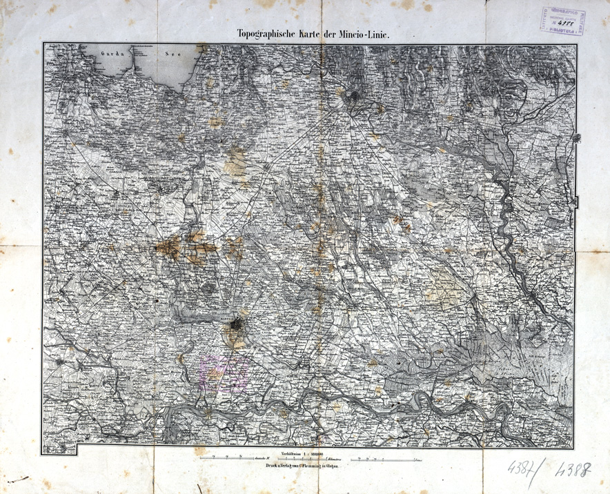 "...IM MAASSTABE VON 1:182.000 NEBST 1 PLAN VON MANTUA IM MASSTABE VON 1:41.200. VERLAG VON CARL FLEMMING IN GLOGAU (s. d.). Un foglio inciso su pietra stampato in nero con orografia dimostrata a mezzo di tratteggio. Carta assai ricca di particolari. Il territorio rappresentato si estende da Pastrengo (nord) a Sabbionetta (sud) e da Castel Goffredo (ovest) a Lonigo (est). Annessa la pianta di Mantova e dintorni. La stessa carta è al numero d'inventario 229."