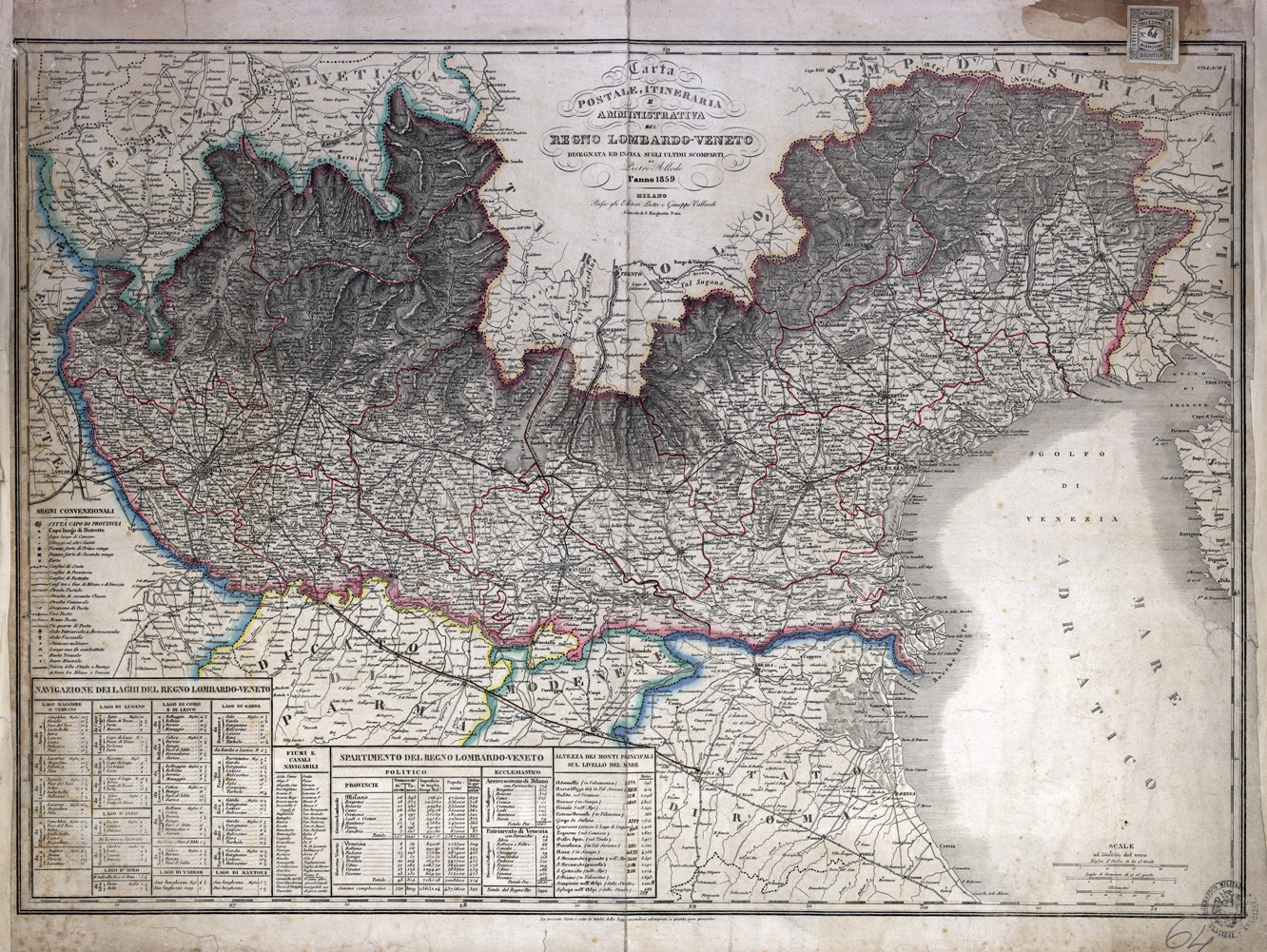 CARTA POSTALE ITINERARIA E AMMINISTRATIVA DEL REGNO LOMBARDO VENETO DISEGNATA E INCISA SUGLI ULTIMI SCOMPARTI DA PIETRO ALLODI. MILANO, PRESSO GLI EDITORI PIETRO E GIUSEPPE VALLARDI.