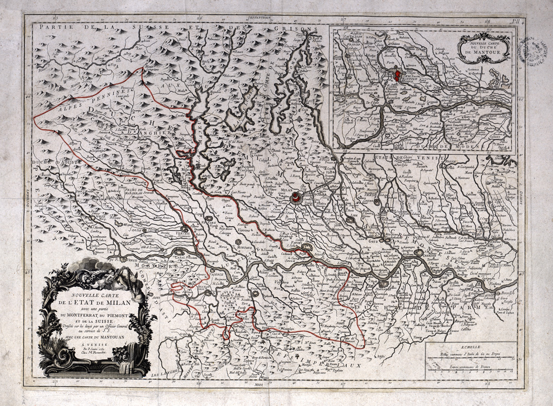 NOUVELLE CARTE DE L'ETAT DE MILAN AVEC UNE PARTIE DU MONFERRAT, DU PIEMONT ET DE LA SUISSE: DRESSEE SUR LES LIEUX PAR UN OFFICIER GENERAL AU SERVICE DE S. S. AVEC UNE CARTE DU MANTOUAN A VENISE. PAR P. SANTINI. CHEZ REMONDINI.