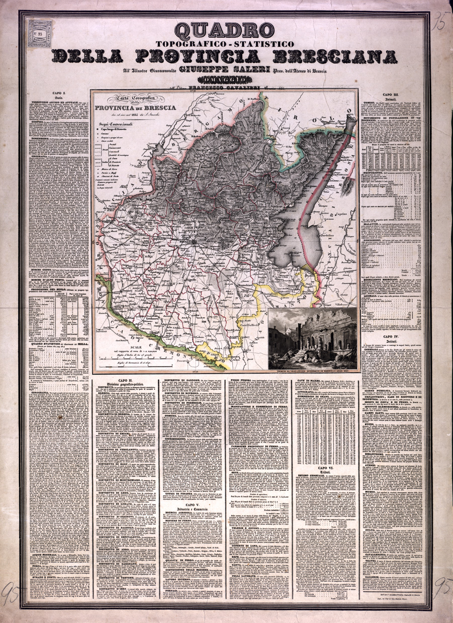 "E' inserita in una tavola delle dimensioni di m. 0,52x0,75 contenente un "Quadro topografico-statistico della Provincia Bresciana" dedicato a Giuseppe Saleri dall'editore Franc. Cavalieri. Senza graduazione marginale. Sono però tracciate le coordinate della città (Duomo) con indicazione dei rispettivi valori (lat. 45°32' long. 27°53' dall'Isola del Ferro). Orografia in artistico tratteggio a luce zenitale. Sono tracciate le strade. Confini a colori. In basso veduta del tempio di Vespasiano. Il "Quadro" contiene notizie di carattere geografico economico, e altre su gli istituti della città compilate da G. B. Pagani."