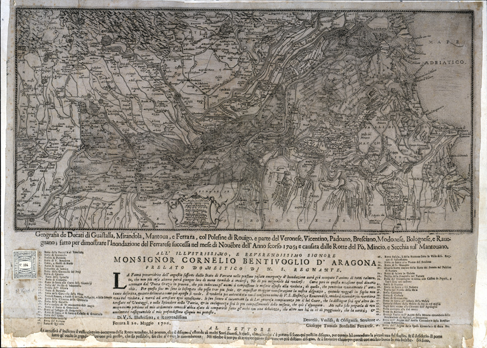 "...COL POLESINE DI ROVIGO, E PARTE DEL VERONESE, VICENTINO, PADOANO, BRESCIANO, MODENESE, BOLOGNESE E RAVEGNANO FATTO PER DIMOSTRARE L'INONDAZIONE DEL FERRARESE SUCCESSA NEL MESE DI NOVEMBRE DELL'ANNO SCORSO 1705 E CAUSATA DALLE ROTTE DEL PO, MINCIO E SECCHIA SUL MANTOVANO. Carta costruita da Tomaso Bonfadini ferrarese, incisa da F. Bolzoni e dedicata a Mons. Cornelio Bentivoglio d'Aragona. Orientazione normale. Manca la graduazione marginale. Orografia prospettica. V'è inserito l'elenco numerico delle rotte dei fiumi. Cinque scale grafiche in misure antiche. (B4)"
