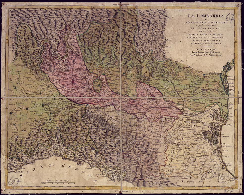 LA LOMBARDIA E STATI AD ESSA CIRCONVICINI LA QUALE COMPRENDE IL CORSO DEL PO CHE CORRE PER LO STATO VENETO E DEL PAPA PER IL DUCATO DI MODENA, MANTOVA, PARMA, MILANO E PIEMONTE SINO A TORINO. VENEZIA PRESSO ANTONIO ZATTA Q. M GIACOMO.