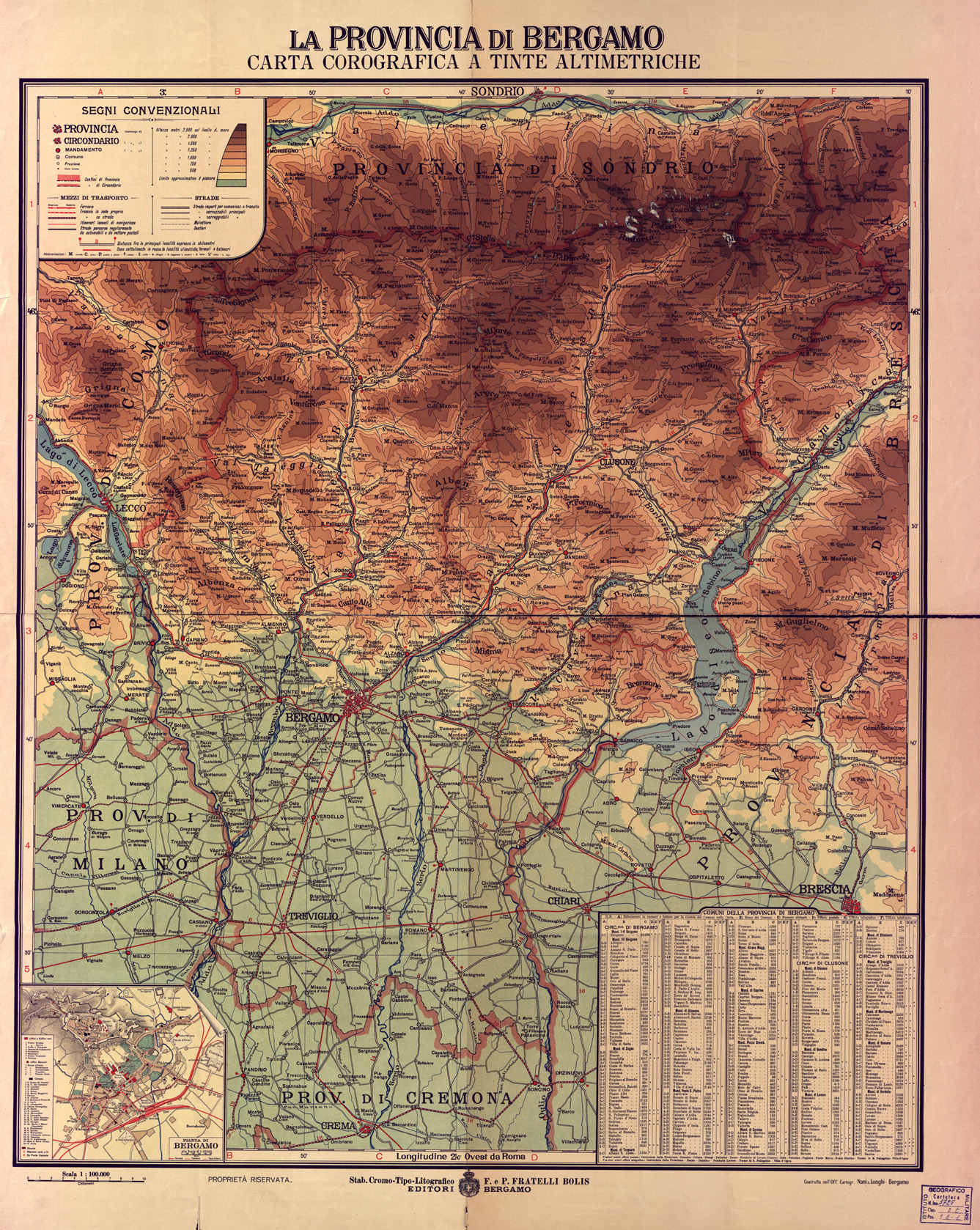 "Rappresentazione orografica a curve a sfumo. In basso a sinistra vi è una pianta di Bergamo alla scala di 1:20.000. Stabilimento Cromo-Tipo-Litografico F. e P. Fratelli Bolis Editori Bergamo. Costrutta nell'Off. Cartogr. Nani&Longhi, Bergamo."