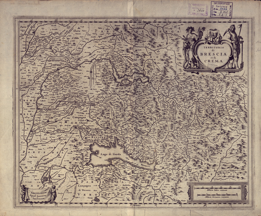 "...AMSTELODAMI APUD IOANNEM IANSONIUM. Foglio inciso su rame. Rappresentazione orografica prospettica. Scala grafica in: Milliaria Italica communia, Milliaria Germanica communia."