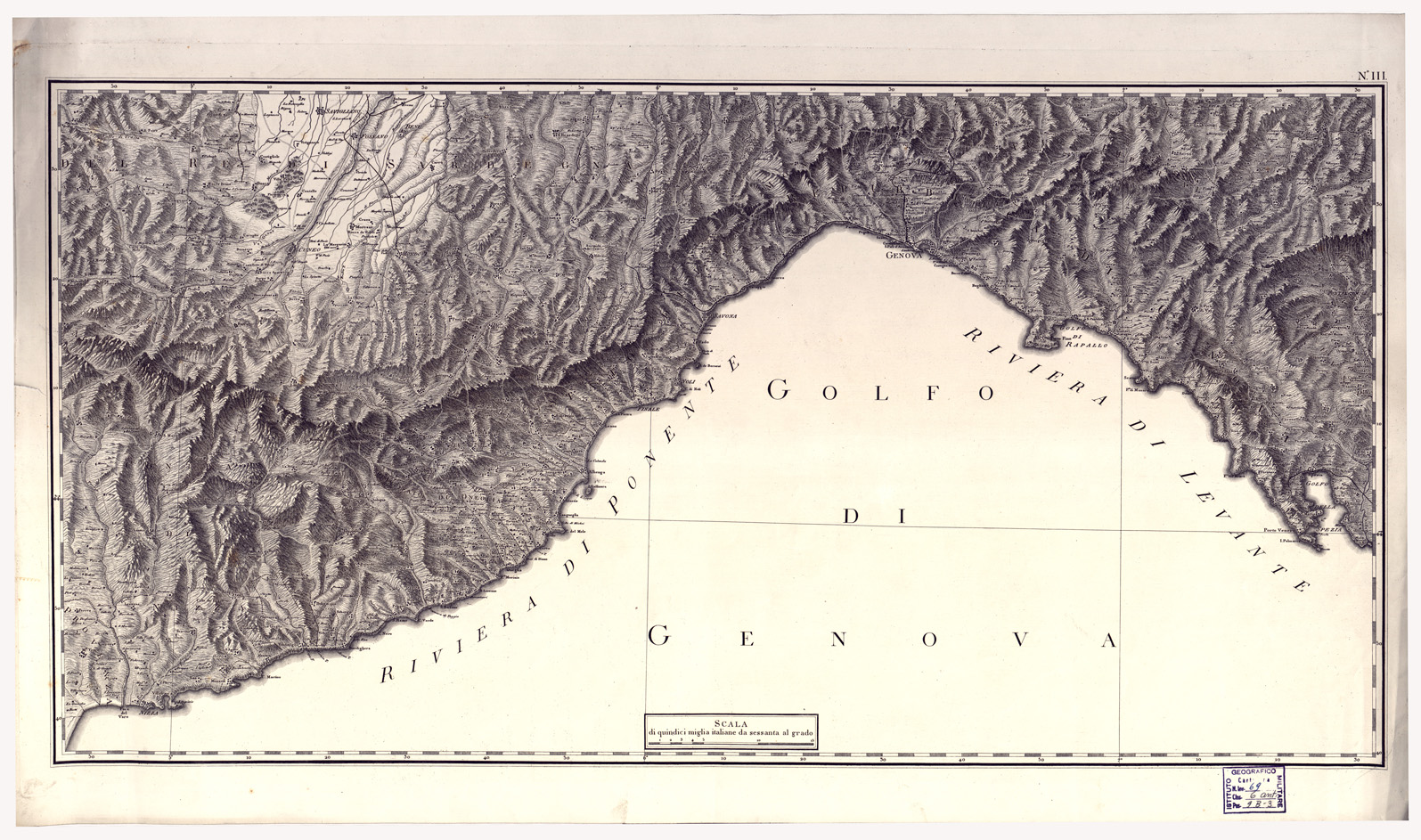 "Bella carta in quattro fogli tratti da incisione su rame, stampati in nero. L'orografia vi è dimostrata mediante artistico tratteggio ad effetto prospettico. Incisore Giuseppe Guerra. Il territorio rappresentato si estende da oltre Biella (nord) al Golfo di Genova (sud) e da Sarzana (ovest) a Rimini (est). La carta mostra abitati, strade principali e secondarie, canali, vegetazioni, risaie, ecc., con una ricchezza di particolari e una nitidezza di disegno veramente pregevoli."