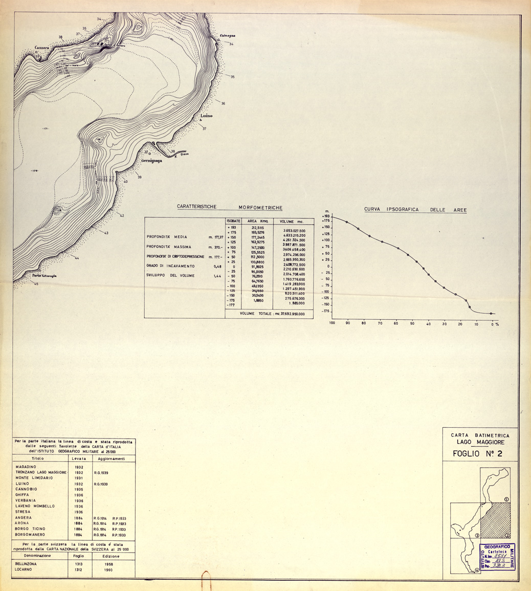 "Istituto Italiano di Idrobiologia (Verbania - Pallanza). La linea di costa è riferita a m. 193 s.l.m. L'equidistanza delle curve a linea continua è di m. 25. L'equidistanza delle curve a tratti è di m. 5. Rilevamento effettuato nel 1961 e 1962 nell'ambito del contratto Euratom 002-61-4 ISP.I, con ecometro ad ultrasuoni da L. Barbanti - A. Carollo - V. Libera. In basso a destra vi è un piccolo quadro d'unione."