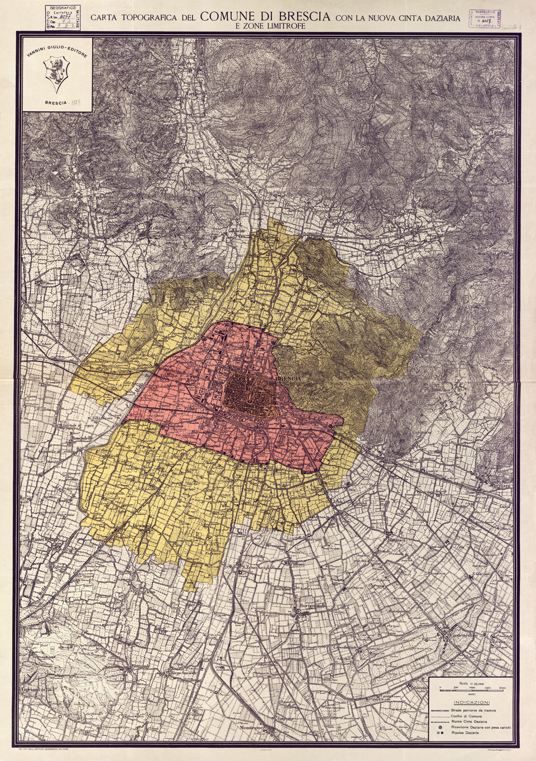 CARTA TOPOGRAFICA DEL COMUNE DI BRESCIA CON LA NUOVA CINTA DAZIARIA E ZONE LIMITROFE. VANNINI GIULIO ED. BRESCIA OFF. CART. P. LONGHI. BERGAMO