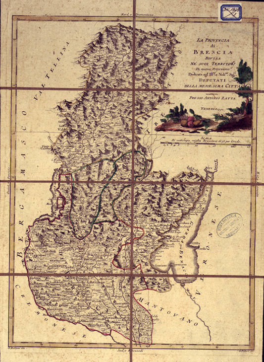 "...DIVISA NEI SUOI TERRITORI. Di nuova proiezione dedicata agli Ill.mi e Nob.mi Sig.ri deputati della medesima città. Incisione a colori, montata su tela a stacchi. Rappresentazione orografica dimostrativa. G. Zuliani incise, G. Pitteri scrisse. Venezia, presso Antonio Zatta."
