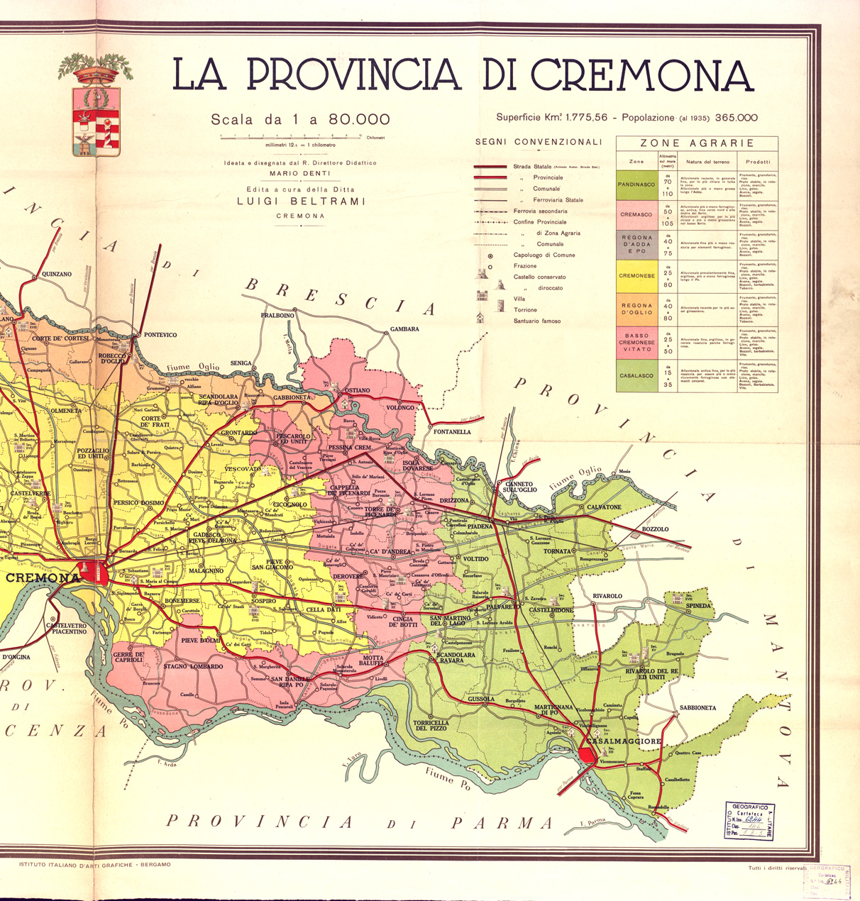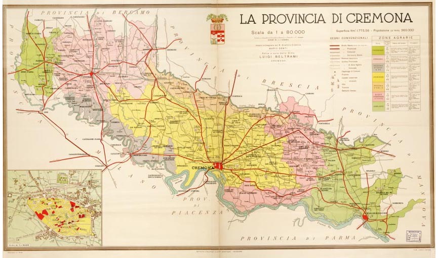 "Rappresentazione orografica planimetrica. Nella parte destra della carta è presente la legenda dei segni convenzionali in basso a sinistra vi è una pianta di Cremona alla scala di 1:10.000. Carta ideata e disegnata dal R. Direttore Didattico Mario Denti edita a cura della Ditta Luigi Beltrami, Cremona. Istituto Italiano d'Arti Grafiche, Bergamo."