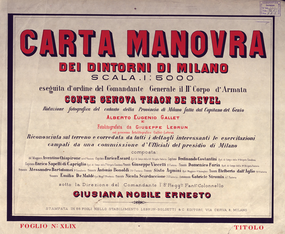 "Eseguita d'ordine del Comandante Generale il II° Corpo d'Armata Conte Genova Thaon De Revel. Riduzione fotografica del catasto della Provincia di Milano fatta dal Capitano del Genio Alberto Eugenio Gallet e fotolitografata da Giuseppe Lebrun col processo fotolitografico Gallet-Lebrun. Riconosciuta sul terreno e corredata da tutti i dettagli interessanti le esercitazioni campali da una commissione d'Ufficiali del presidio di Milano composta: del Maggiore Aventino Chiapirone nel 47° Fanteria - Capitano Enrico Escard Aiut. di Campo della 29^ Brigata Fanteria - Capitano Ferdinando Costantini Aiut. di Campo della 3^ Brigata Cavalleria - Capitano Enrico Sapelli di Capriglio Aiut. di Campo della 7^ Brigata Cavalleria - Tenente Giuseppe Viecelli 8° Fanteria - Tenente Domenico Furia Aiut. di Campo della 6^ Brigata Fanteria - Tenente Alessandro Bartolomei 9° Cavalleria - Tenente Antonio Bonoldi 75° Fanteria - Tenente Sisto Aymini Aiut. Maggiore 8° Bersaglieri - Tenente Etelberto dall'Aglio 75° Fanteria - Tenente Emilio De Maldé Aiut. Maggiore 7° Fanteria - Tenente Nicola Scardaccione 75° Fanteria - Sottotenente Gabriele Strumia 47° Fanteria sotto la Direzione del Comandante l'8° Regg.to Fant.a Colonnello Giusiana Nobile Ernesto. Le altimetrie della Carta Manovra furono favorite dall'Ingegnere Cavaliere Villoresi. Le ricognizioni degli Ufficiali furono disegnate sulle pietre fotolitografiche dai disegnatori dello stabilimento. Carta stampata in 56 fogli nello stabilimento Lebrun-Boldetti & C. Editori, via Cerva 8, Milano. Nel documento sono presenti anche 16 fogli alla scala 1:10.000."