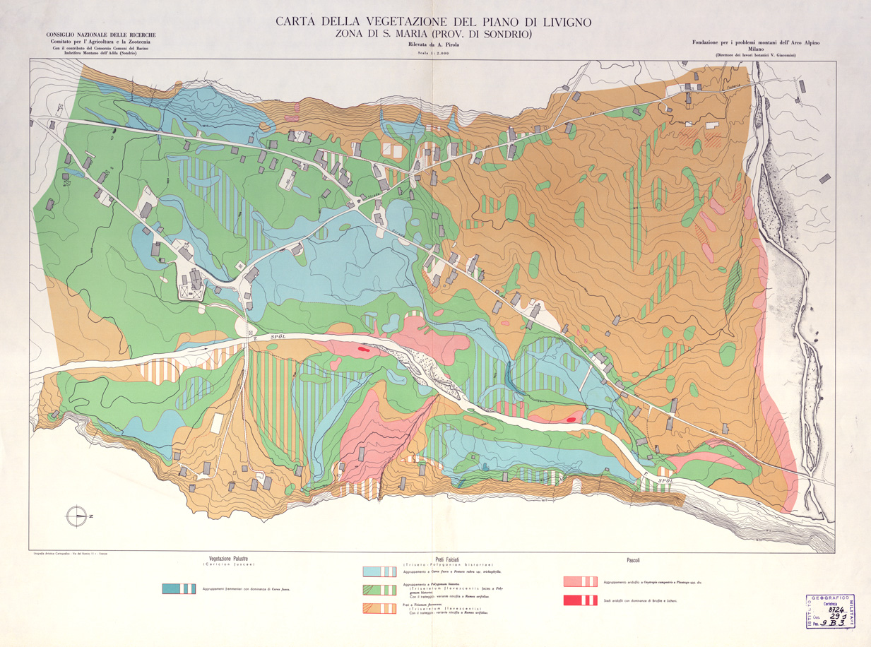"Consiglio Nazionale delle Ricerche, Comitato per l'Agricoltura e la Zootecnia con il contributo del Consorzio Comuni del Bacino Imbrifero Montano dell'Adda (Sondrio). Fondazione per i problemi montani dell'Arco Alpino, Milano: direttore dei lavori botanici V. Giacomini. Carta rilevata da A. Pirola. Litografia Artistica Cartografica, Firenze. Rappresentazione orografica a curve di livello, in basso vi sono le indicazioni colorate riferite alla vegetazione ed ai pascoli."