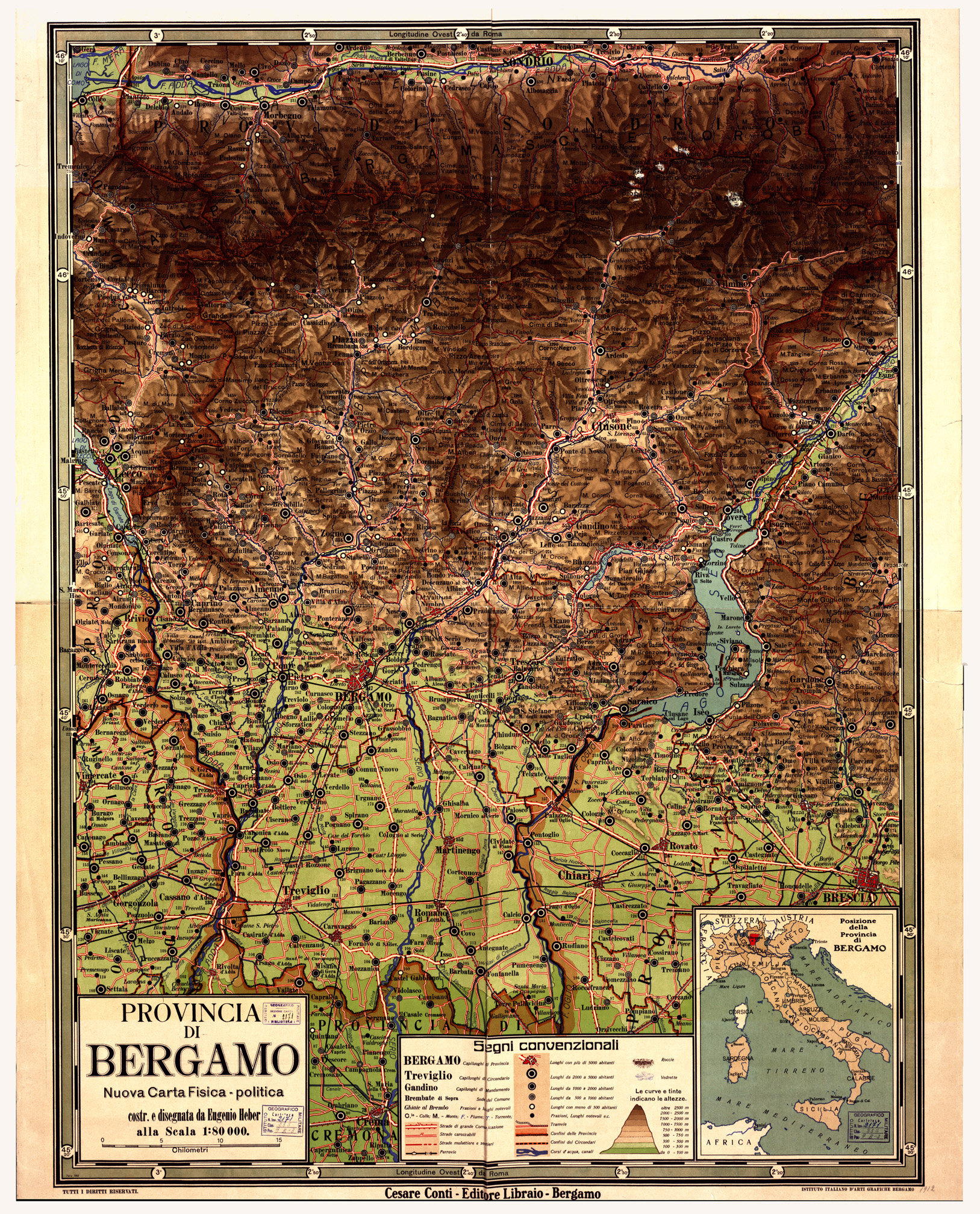 "Carta costruita e disegnata da Eugenio Heber rappresentazione orografica a tinte ipsometriche. In basso è presente la legenda dei segni convenzionali ed un riquadro dove è segnalata la posizione della provincia di Bergamo. Cesare Conti Editore Libraio, Bergamo. Istituto Italiano d'Arti Grafiche, Bergamo."