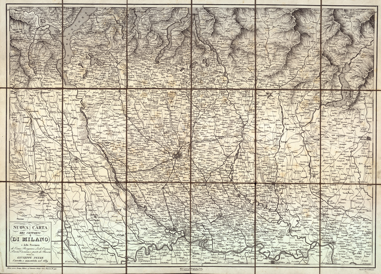 "...INCISA DA GIUSEPPE PEZZE. CORRETTA E AUMENTATA NEL 1839. MILANO, PRESSO GIUSEPPE MOLINARI, ECC. Un foglio montato su tela a stacchi, stampato in nero, tratto da nitida incisione, con orografia rappresentata mediante il tratteggio a luce obliqua. Carta ricca di dettagli. in basso è scritto "Deposta all'I. R. Biblioteca". Scala grafica in miglia comuni d'Italia. E' contenuta in busta su cui è stampato "Carte routiere. Milan Chez Ferd. Artaria e Fils" e quindi a mano "Contorni di Milano". (v. numero d´ordine 74 Collezione Pasqui n. 8)"
