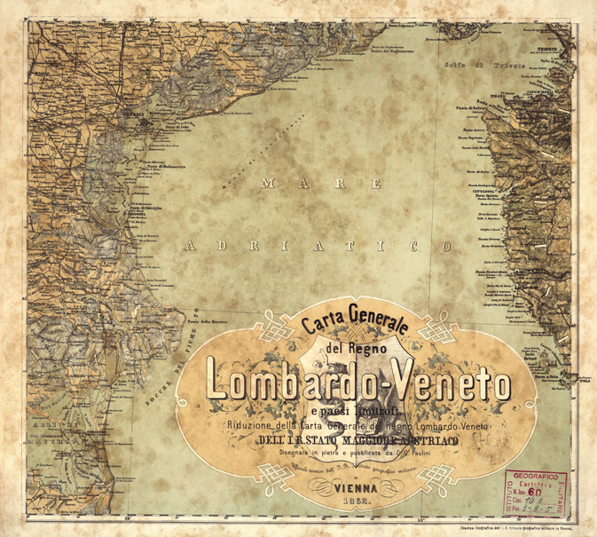 "DISEGNATA IN PIETRA E PUBBLICATA DA C. C. PAULINI UFFICIALE TECNICO DELL'I. R. I.G.M. IN VIENNA. La carta è in un sol foglio montato su tela a stacchi. E' stampata a colori con orografia a sfumo in bistro, fondo generale del terreno in giallino, acque in azzurro, strade principali in rosso, boschi in verde, confini politici a colori. Essa distingue gli abitati in base alla loro importanza amministrativa, chiese, osterie, case isolate, alpi, stazioni postali, miniere, fabbriche, acque minerali, bagni, ecc., risaie e paludi. Le strade sono distinte in cinque classi con indicazione delle poste. Sono tracciati anche i confini amministrativi. In basso a sinistra la legenda dei segni convenzionali e le scale grafiche in miglia italiane e in miglia di Germania. Limiti: nord, Lienz sud, Bologna ovest, Lago d'Iseo est, Trieste."