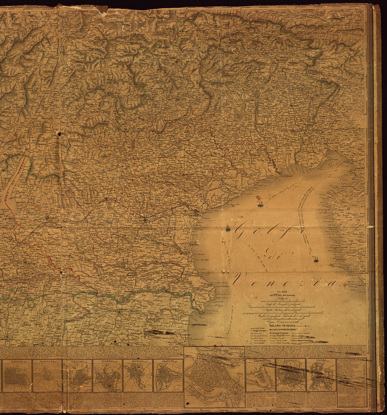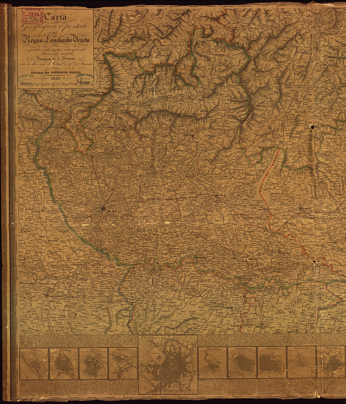 "Carta compilata sulle migliori carte generali e Provinciali esistenti. Disegnata da C. Pinchetti sotto la direzione dell'Ing.re Geog.fo Gio. Brenna ed incisa da Giuseppe Pezze. In basso a scale varie sono presenti le piante di: Como, Pavia, Lodi, Bergamo, Milano, Sondrio, Cremona, Brescia, Mantova, Verona, Vicenza, Rovigo, Padova, Venezia, Belluno, Treviso e Udine. Milano presso Gio. Cogliati Neg.to di Stampe C.da della Passarella 491."
