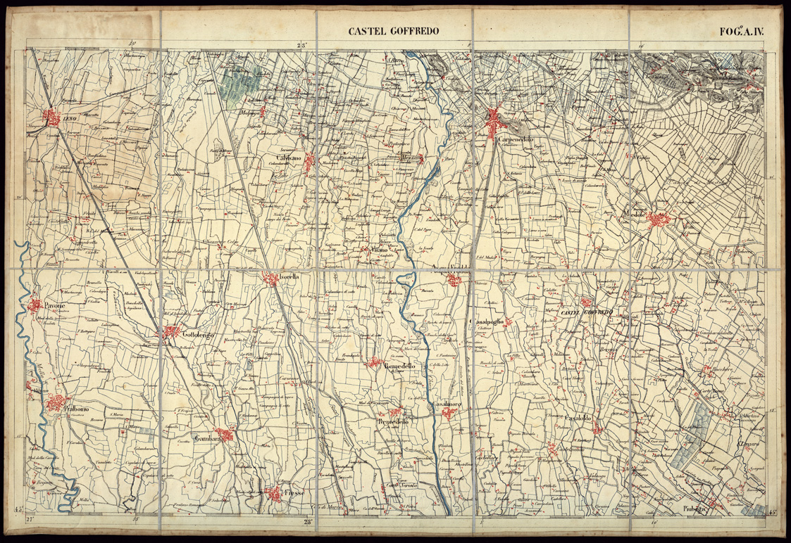 "...AUTOGRAFATA NELL'UFFICIO TOPOGRAFICODEL CORPO REALE DELLO STATO MAGGIORE. TORINO, 1859. Stampa della carta di cui al numero d'ordine 99 (Cart. d'Arch. n. 45. Doc. n. 8) in ventiquattro fogli in cromolitografia. Il foglio C. VI contiene il titolo e il quadro d'unione. La stessa carta è presente alla cartella d'archivio n. 58 documento n. 22."