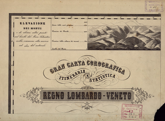 "... DIVISA IN 48 FOGLI SULL'AMPIA SCALA DI 1:172.800 DEL NATURALE COLL'INDICAZIONE DELLE DISTANZE CHE CORRONO DA PAESE A PAESE SEGNATE SOPRA OGNI TRONCO DI STRADA IN MIGLIA GEOGRAFICHE ITALIANE DA 60 AL GRADO. COMPILATA DA ALESSANDRO MARIDATI. RIVEDUTA E AUTENTICATA DAI SINGOLI I. I. R. R. UFFICI PROVINCIALI DELLE PUBBLICHE COSTRUZIONI. MILANO 1858. Bella carta tratta da nitida incisione su rame stampata in nero con confini politici a colori. L'orografia è dimostrata a mezzo di fine tratteggio a luce obliqua. Alcuni dei fogli contengono piante delle città principali con annesso elenco numerico delle costruzioni principali. Altri contengono tabelle statistico-amministrative, elenchi delle coordinate dei luoghi più importanti, quadri e notizie intorno alla navigazione dei canali, i servizi ferroviari e telegrafici, ecc., il foglio E2 contiene una "Tavola dimostrativa in 1/4 il numero delle poste stabilito dell'una all'altra stazione nel Regno Lombardo Veneto colle relative competenze in base alla vigente tariffa ". Due copie."