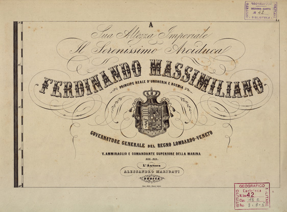 "...... DIVISA IN 48 FOGLI SULL'AMPIA SCALA DI 1:172.800 DEL NATURALE COLL'INDICAZIONE DELLE DISTANZE CHE CORRONO DA PAESE A PAESE SEGNATE SOPRA OGNI TRONCO DI STRADA IN MIGLIA GEOGRAFICHE ITALIANE DA 60 AL GRADO. COMPILATA DA ALESSANDRO MARIDATI. RIVEDUTA E AUTENTICATA DAI SINGOLI I. I. R. R. UFFICI PROVINCIALI DELLE PUBBLICHE COSTRUZIONI. MILANO 1858. Bella carta tratta da nitida incisione su rame stampata in nero con confini politici a colori. L'orografia è dimostrata a mezzo di fine tratteggio a luce obliqua. Alcuni dei fogli contengono piante delle città principali con annesso elenco numerico delle costruzioni principali. Altri contengono tabelle statistico-amministrative, elenchi delle coordinate dei luoghi più importanti, quadri e notizie intorno alla navigazione dei canali, i servizi ferroviari e telegrafici, ecc., il foglio E2 contiene una "Tavola dimostrativa in 1/4 il numero delle poste stabilito dell'una all'altra stazione nel Regno Lombardo Veneto colle relative competenze in base alla vigente tariffa". Due copie."