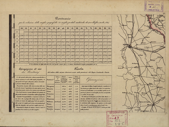 "... DIVISA IN 48 FOGLI SULL'AMPIA SCALA DI 1:172.800 DEL NATURALE COLL'INDICAZIONE DELLE DISTANZE CHE CORRONO DA PAESE A PAESE SEGNATE SOPRA OGNI TRONCO DI STRADA IN MIGLIA GEOGRAFICHE ITALIANE DA 60 AL GRADO. COMPILATA DA ALESSANDRO MARIDATI. RIVEDUTA E AUTENTICATA DAI SINGOLI I. I. R. R. UFFICI PROVINCIALI DELLE PUBBLICHE COSTRUZIONI. MILANO 1858. Bella carta tratta da nitida incisione su rame stampata in nero con confini politici a colori. L'orografia è dimostrata a mezzo di fine tratteggio a luce obliqua. Alcuni dei fogli contengono piante delle città principali con annesso elenco numerico delle costruzioni principali. Altri contengono tabelle statistico-amministrative, elenchi delle coordinate dei luoghi più importanti, quadri e notizie intorno alla navigazione dei canali, i servizi ferroviari e telegrafici, ecc., il foglio E2 contiene una "Tavola dimostrativa in 1/4 il numero delle poste stabilito dell'una all'altra stazione nel Regno Lombardo Veneto colle relative competenze in base alla vigente tariffa". Due copie."