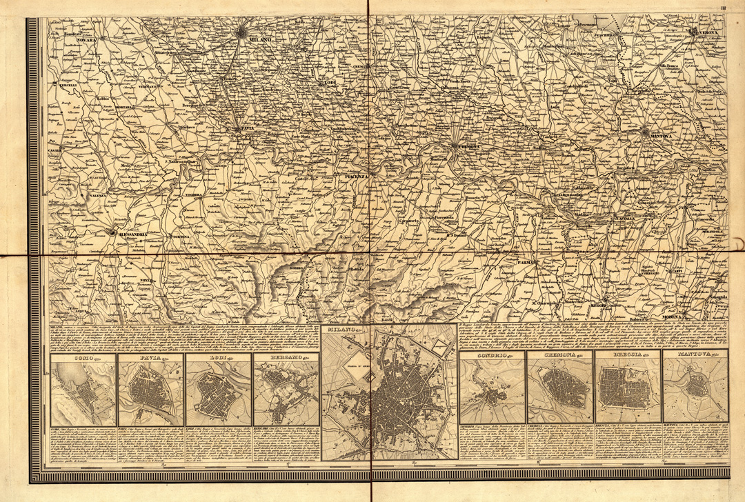 "Incisione su rame in quattro fogli montati su tela a stacchi. Orientazione normale. Graduazione marginale. Longitudini derivate dal meridiano di Parigi. Orografia a tratteggio a luce obliqua. Abitati distinti in base alla loro importanza amministrativa. Strade classificate in postali, provinciali, comunali e sentieri con indicazioni delle stazioni e delle corse postali. I2 due fogli meridionali contengono varie piantine delle principali città con notizie illustrative. Vi sono pure una tabella delle altezze dei monti principali, e notizie sui canali navigabili. La carta fu costruita nel 1831, aumentata e riveduta nel 1848. (Cnfr. Marinelli, Saggio, ecc., N° 1632). La copia Collez. Bianconi N° 63 manca del foglio nord- occidentale. la Copia d'Archivio è in foglio unico montato su tela a stacchi (m. 0,83 X 1,26) reca lo stesso titolo con l'aggiunta: "novamente corretta ed aumentata colle strade ferrate e il telegrafo, 1859. Cesare Crivelli, editore stampatore in Rame ecc., in Milano". I confini politici vi sono tracciati a colori: le ferrovie in nero."