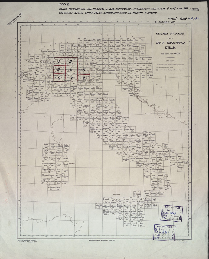 "E' la celebre carta costruita dagli astronomi dell'osservatorio di Brera, A. Cesaris, F. Reggio, B. Oriani, disegnata da C. Pinchetti e incisa da B.Bordiga. Si compone di otto fogli i cui rami, trafugati a Vienna nel 1796, tornarono di proprietà dell'osservatorio col ritorno dei francesi in Italia (1804). A Vienna, ove fu completata l'incisione della carta (foglio di Milano e dintorni), fu aggiunto anche il foglio titolo, inciso su rame più piccolo, senza indicazione di autori e di data. La carta è stampata in nero, con orografia dimostrata mediante artistico tratteggio. L'una copia è l'antico esemplare della carta senza titolo, rilegata in libro vi si aggiunge un secondo foglio sciolto di Milano e dintorni montato su tela a stacchi l'altra è la ristampa eseguita dall' I.G.M nel 1927 su rami originali inviati da Brera. Per notizie sulle vicende e la costruzione della carta si veda : Mori A., La cartografia ufficiale in Italia e l'I.G.M. Combi M., La carta della Lombardia del secolo XVIII. Gabba L., La carta della Lombardia a cura degli astronomi di Brera, in l'Universo 1928 N°7."