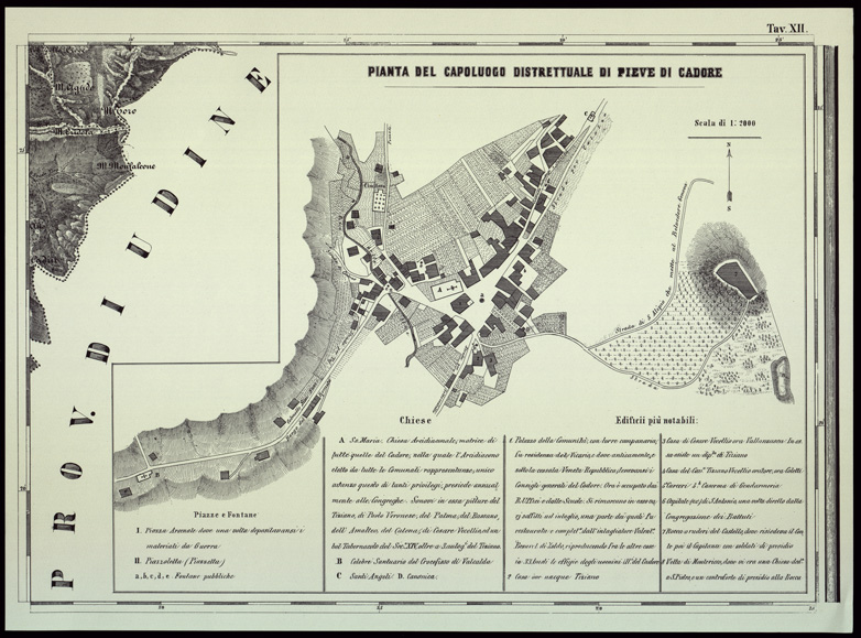 "...PUBBLICATA DAL LITOGRAFO BELLUNESE ANGELO GUERNIERI DA CUI PER COMMISSIONE DELL'INCLITO COLLEGIO PROVINCIALE FU ESEGUITO IL LAVORO. 1866 Nella carta è presenta anche la pianta della città di Pieve di Cadore alla scala di 1:2.000."