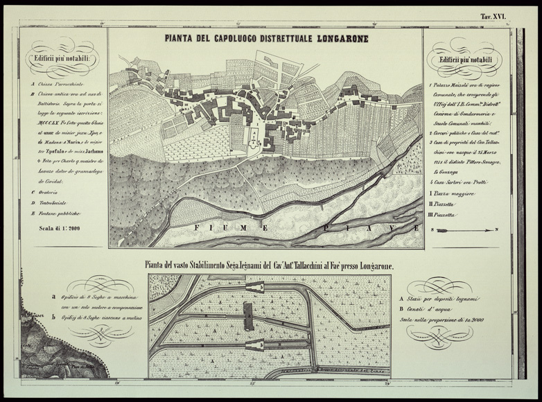 "...PUBBLICATA DAL LITOGRAFO BELLUNESE ANGELO GUERNIERI DA CUI PER COMMISSIONE DELL'INCLITO COLLEGIO PROVINCIALE FU ESEGUITO IL LAVORO. 1866 Nella carta si trova anche la pianta della città di Longarone alla scala 1:2.000."